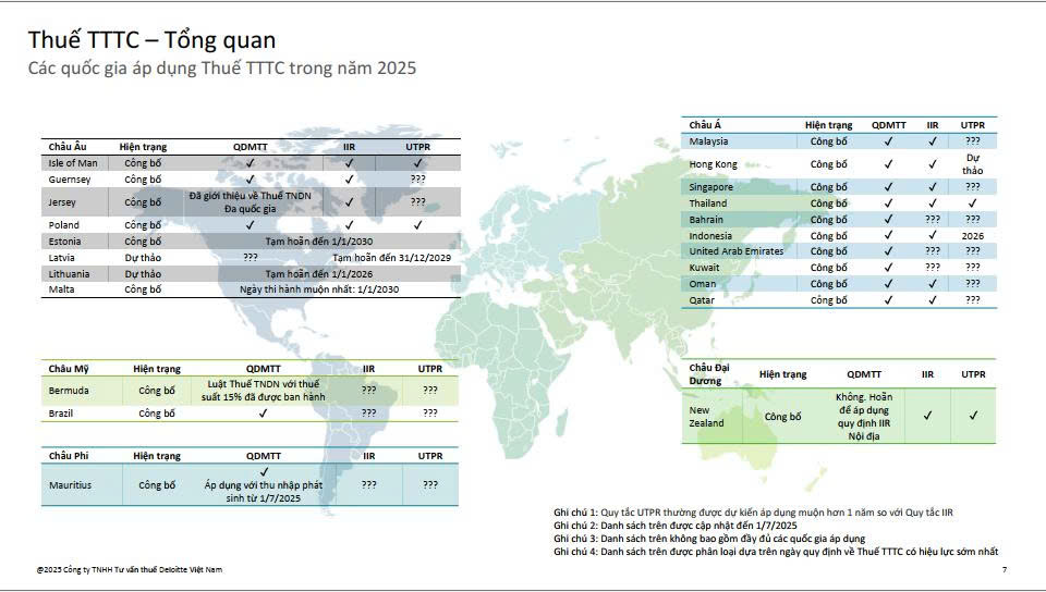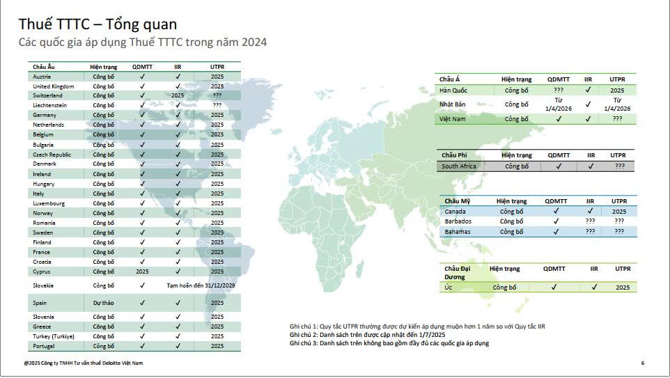 Nội dung tập trung vào Thuế Tối thiểu Toàn cầu (Global Minimum Tax - GMT hoặc Thuế TTTC), một phần của sáng kiến BEPS 2.0 (Pillar 2) của OECD nhằm chống xói mòn cơ sở thuế và chuyển lợi nhuận (Base Erosion and Profit Shifting). Cập nhật tình hình áp dụng tại Việt Nam và toàn cầu, với các quy định dự kiến hiệu lực từ năm 2024-2025.